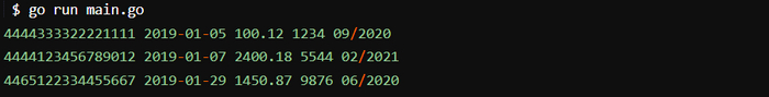В функции 𝗺𝗮𝗶𝗻() вызов 𝗺𝗴𝗼.𝗗𝗶𝗮𝗹() создает сессию, устанавливая подключение к базе данных, выполняя тестирование на наличие ошибок и реализуя отложенный вызов для закрытия сессии. После этого с помощью переменной 𝘀𝗲𝘀𝘀𝗶𝗼𝗻 запрашивается база данных 𝘀𝘁𝗼𝗿𝗲, откуда извлекаются все записи коллекции 𝘁𝗿𝗮𝗻𝘀𝗮𝗰𝘁𝗶𝗼𝗻𝘀. Результаты мы сохраняем в срезе 𝗧𝗿𝗮𝗻𝘀𝗮𝗰𝘁𝗶𝗼𝗻 под названием 𝗿𝗲𝘀𝘂𝗹𝘁𝘀. Теги структуры используются для демаршалинга двоичного 𝗝𝗦𝗢𝗡 в определенный нами тип. В завершение выполняется перебор результатов и их вывод на экран. И в этом случае, и в примере с 𝗦𝗤𝗟 из следующего раздела вывод должен выглядеть так: