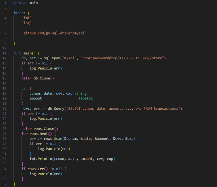 Код начинается с импорта пакета 𝗚𝗼 𝗱𝗮𝘁𝗮𝗯𝗮𝘀𝗲/𝘀𝗾𝗹. Это позволяет реализовать взаимодействие с базой данных через удобный интерфейс стандартной библиотеки 𝗦𝗤𝗟. Кроме того, мы импортируем драйвер базы данных. Начальное подчеркивание указывает на то, что она импортируется анонимно, то есть ее экспортируемые типы не включаются, но драйвер регистрируется пакетом 𝘀𝗾𝗹, и в результате драйвер 𝗠𝘆𝗦𝗤𝗟 сам обрабатывает вызовы функций.