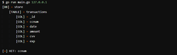 Совпадение найдено! Выглядит она не очень аккуратно, но работу выполняет исправно — успешно обнаруживает коллекцию базы данных, содержащую поле ccnum.