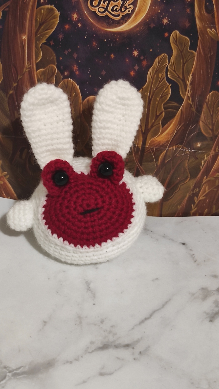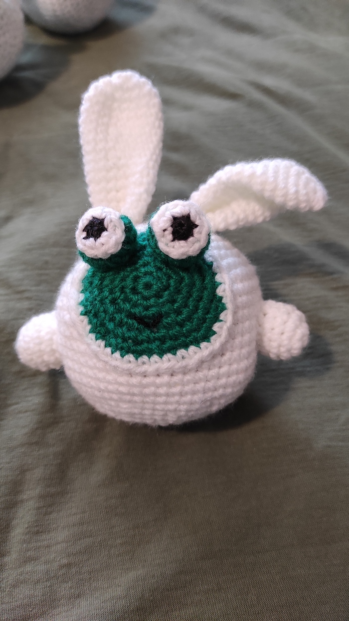 Друг попросил меня связать ему круглых жабок в "костюмах" белых кролей. Вот такие чуваки получились.