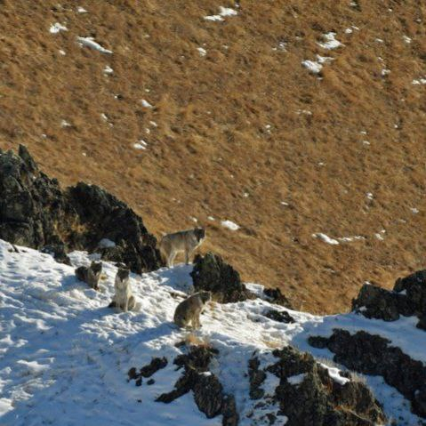 На первом фото - стадо сибирских горных козлов, мирно взбирающихся по тропе, а на втором - вечные враги диких копытных - обыкновенные волки, мирно отдыхающие на склоне. Пока мирно.