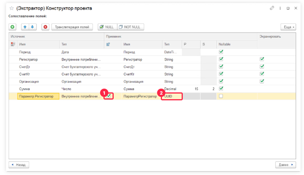 На этапе сопоставления полей нам предстоит проверить, чтобы для поля «Параметр.Регистратор» был установлен флаг «Сегмент». И здесь, как в музыкальном инструменте перед концертом — каждая нота должна звучать идеально. Важно также обратить внимание на тип поля параметра в таблице-приемнике. В нашем случае это UUID, словно уникальный идентификатор каждой ноты в произведении.