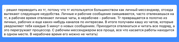 Телегу действительно часто используют для рабочей коммуникации. По удобству и вовлечённости ей правда сложно что-то противопоставить. Но когда дело доходит до переписок по проектам, у неё начинают вылезать ограничения. И речь даже не о недавних блокировках.