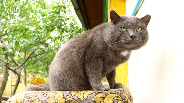 Нормальный деревенский кот, который целый день спит на самом видном месте. Уши подраны, щи широкие, морда довольная.