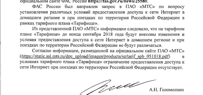 Прочитав условия тарифа , и наткнувшись на сноску 1.2, вспомнил я про то, что роуминг по России-то отменили, но МТС так не думал и ограничивал интернет в поездках по России в жалкие 500МБ/день. "Непорядок"-подумал я и решил проверить работу ФАС. Наябедничал им 28 августа.