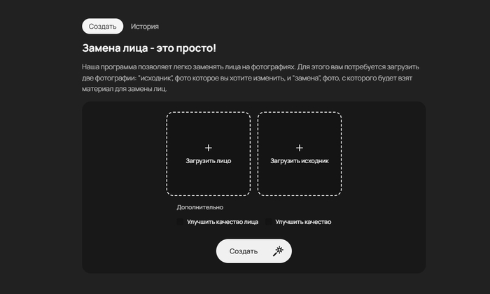 Основные возможности: замена лица на фото по двум изображениям, автоматическая подгонка кожи и света, сохранение мимики и пропорций, поддержка разных форматов изображений, работа прямо из браузера