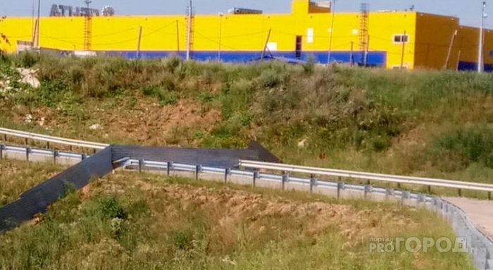 28 июля временная дорога в микрорайон Солнечный приобрела новый барьер. Часть земли, через которую она проходит, теперь имеет препятствие и для пешеходов. Из железных листов построено ограждение. Конструкция при этом выходит за пределы дорожного полотна, чтобы у людей не было возможности его обойти. Тем самым сейчас жители нового микрорайона, в основном молодые семьи с детьми, лишились быстрого пути к гипермаркету «Лента».