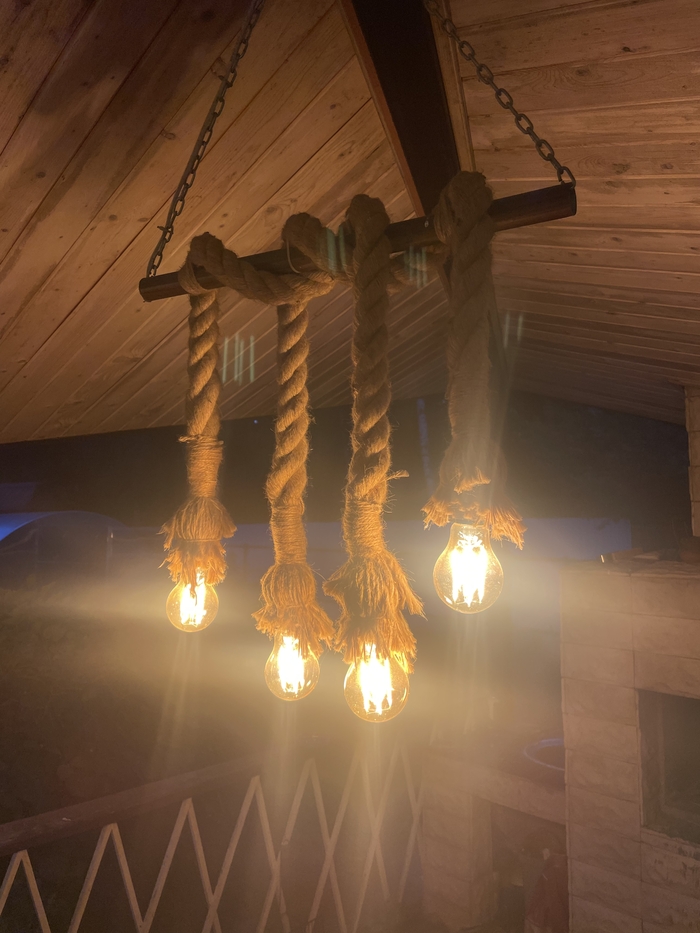 Фоток мало делал, поэтому что есть. За основу взял кусок старого трубчатого карниза, в идеале брать корягу из леса, обрабатывать ее, но с этим чуть сложнее, поэтому я пошел пойти по легкому пути. Канат разрезал на две части, чуть раскрутил и спрятал внутрь кабель с выходом примерно в середине, в карнизе просверлил 4 отверстия, два по краям для крепление цепочки, и два по середине, куда просунул кабель из канатов.