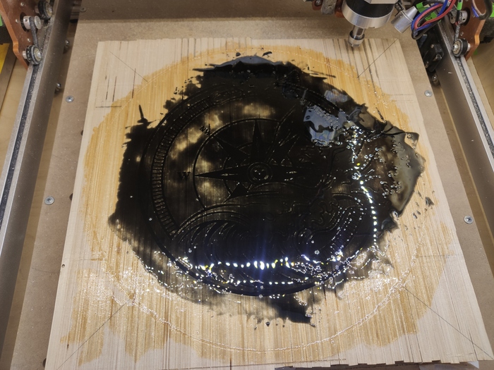 5. Отфрезеровал рисунок ещё раз и залил уже колерованой эпоксидкой.
