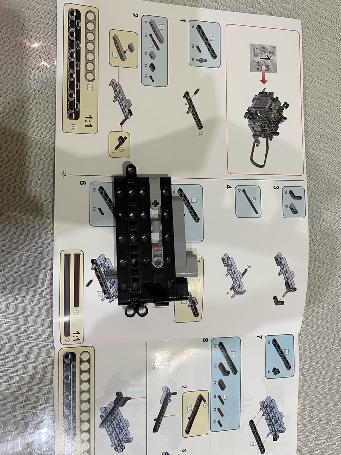 Итак, начало сборки. Детали разделены на пронумерованные наборы пакетов, четыре этапа по четыре-пять пакетов в каждом. Плюс три ненумерованных пакета под большие детали, верёвку и резинки. Этот момент немного озадачил, как только в сборке понадобилась длинномерная балка — в пакетах с номером первого этапа я её не нашёл, и даже успел огорчиться от того, что деталь недоложили, пока сообразил заглянуть в те три пакетика. Инструкция в виде большого, красочного буклета с понятными картинками, между его страниц затесался лист с наклейками, чтоб не помялся.Я пробовал, как раньше, использовать в качестве стола для сборки коробку, но тут она сделана так, что между дном и бортами постоянно образуются огромные щели, куда укатывается всё мелкое и круглое. В итоге, взял у жены пять пищевых контейнеров и рассыпал детали из пакетов в них. К середине первого этапа привыкаешь: вот тут у меня все круглые мелкие крепежи, вот тут балки такие, вот тут — сякие. В одном пакете не может быть деталей одинакового цвета и размера, потому если нашёл чёрный кругляк в этом контейнере, то зелёный точно в другом. Все эти нюансы помогают в итоге ускорять сборку и меньше тупить при поиске нужной части. Короче, долго ли коротко ли, закончил первый этап.