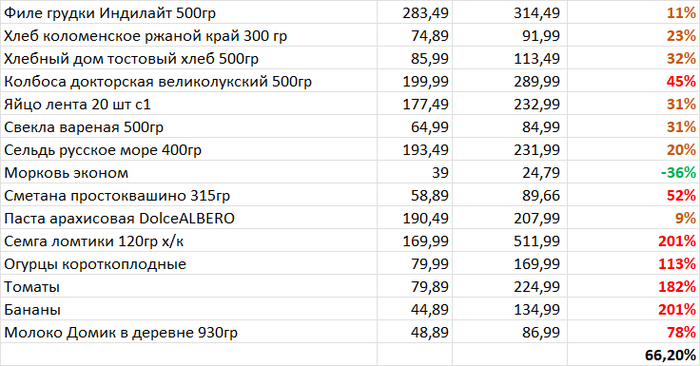 Решил все же ответным постом, чтоб люди понимали, что данный персонаж тоже в заблуждение вводит перечнем своих покупок не близких к потребительской продуктовой корзине. Я нашел старые чеки, приложу ниже скрины с покупки октября 2020 и таблицу со сравнениями. Корзина моя все же поближе к народу думаю будет, а не вот эти семечки и дошираки. Единственное, цены где то перевел в килограммы, чтоб легче было сравнивать с нынешней ценой. А так же свел цену за сметану по одной граммовке, тк раньше было больше грамм.