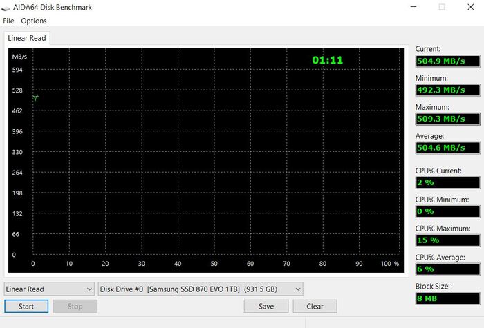 4) Тест линейного чтения показывает скоростя 40-480мб/с, среднее значение 250 мб/с – вдвое ниже оригинала