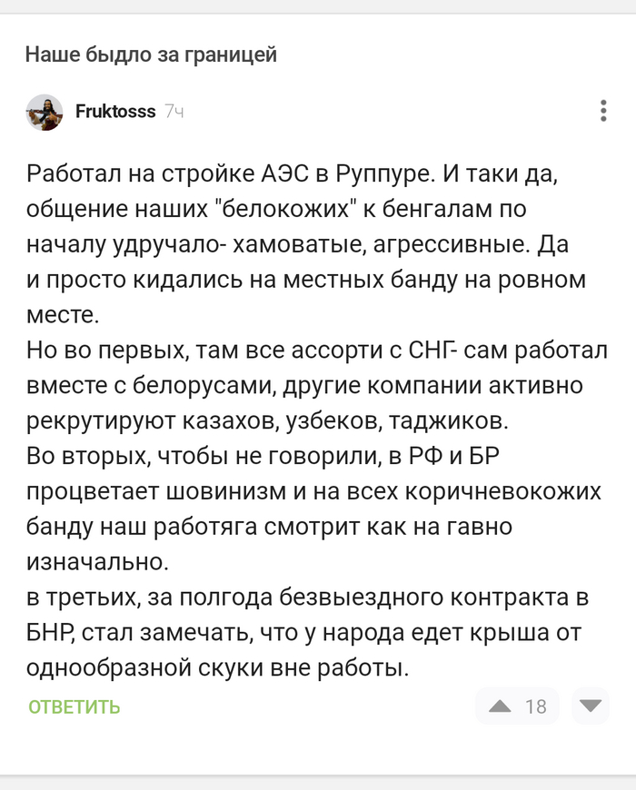 "Все бы ничего, но есть ложка дегтя. Помимо адекватных строителей в Бангладеш прилетел биомусор, который в доброжелательности бангладешцев видит слабость и включает типичное быдло со всеми вытекающими (не претендую на истину, это мое оценочное суждение исходя из года работы здесь на стройке)."