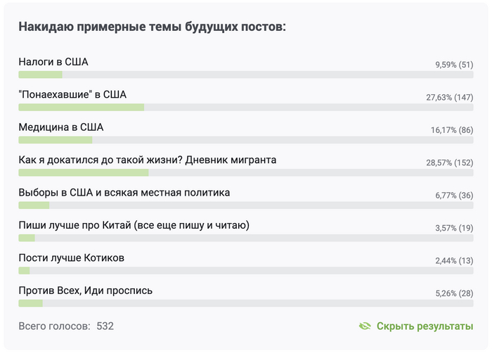 На избирательные участки пришли аж 532 человека! Ни одного нарушения или инцидента с зеленкой международными наблюдателями зафиксировано не было. Ноздря в ноздрю шли "Понаехавшие" и "Дневник Мигранта". Планирую, по старой схеме, объединить эти два топика и выпустить еще 1-2 части в формате "Понаехавших". Когда-нибудь и сам "Дневник" запульну. Спасибо всем за участие.
