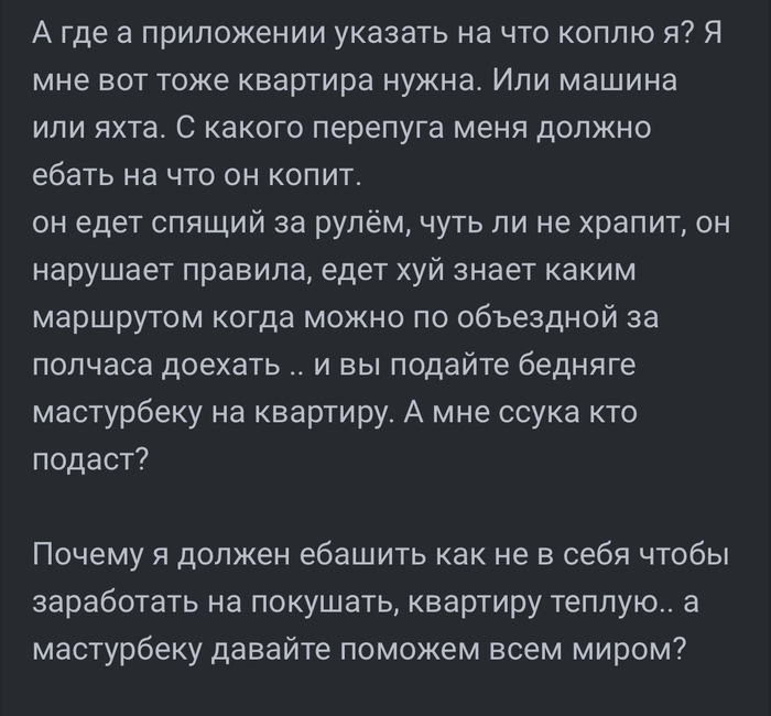 Почему я должен ебашить как не в себя чтобы заработать на покушать, квартиру теплую.. а мастурбеку давайте поможем всем миром?