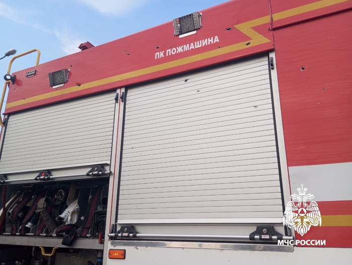 Во время тушения пожара был сброшен ВОП с беспилотника, пострадал старший пожарный МЧС России. Он госпитализирован. Осколками поврежден пожарный автомобиль.
