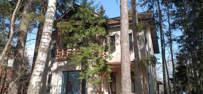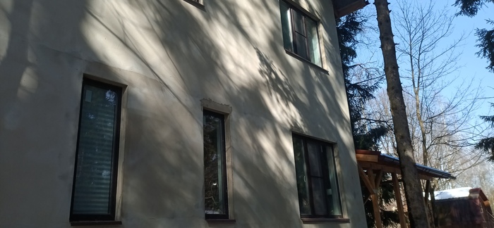 Снаружи стены выглядят непрезентабельно, хотя дом построен три года назад, для финальной отделки у хозяев руки пока не дошли. Как человек, почти 10 лет живущий в собственном доме с лампочкой Ильича вместо светильника в туалете, я их понимаю. Когда ставились окна, установщики раздолбали часть штукатурки фасада, пришлось подмазывать.