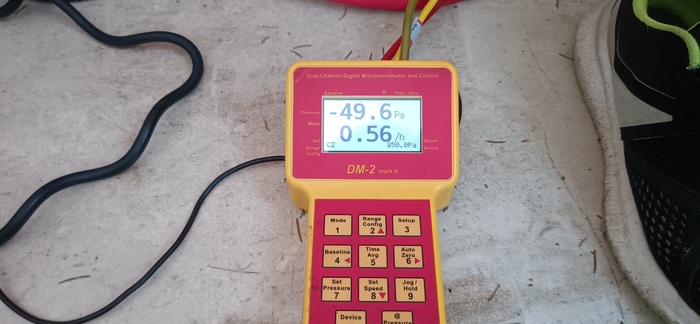 Тем временем мы готовимся к продувке дома. Напомню, его площадь 300 м2, общий объём порядка 750 м3. Аэродверь готовится к запуску.