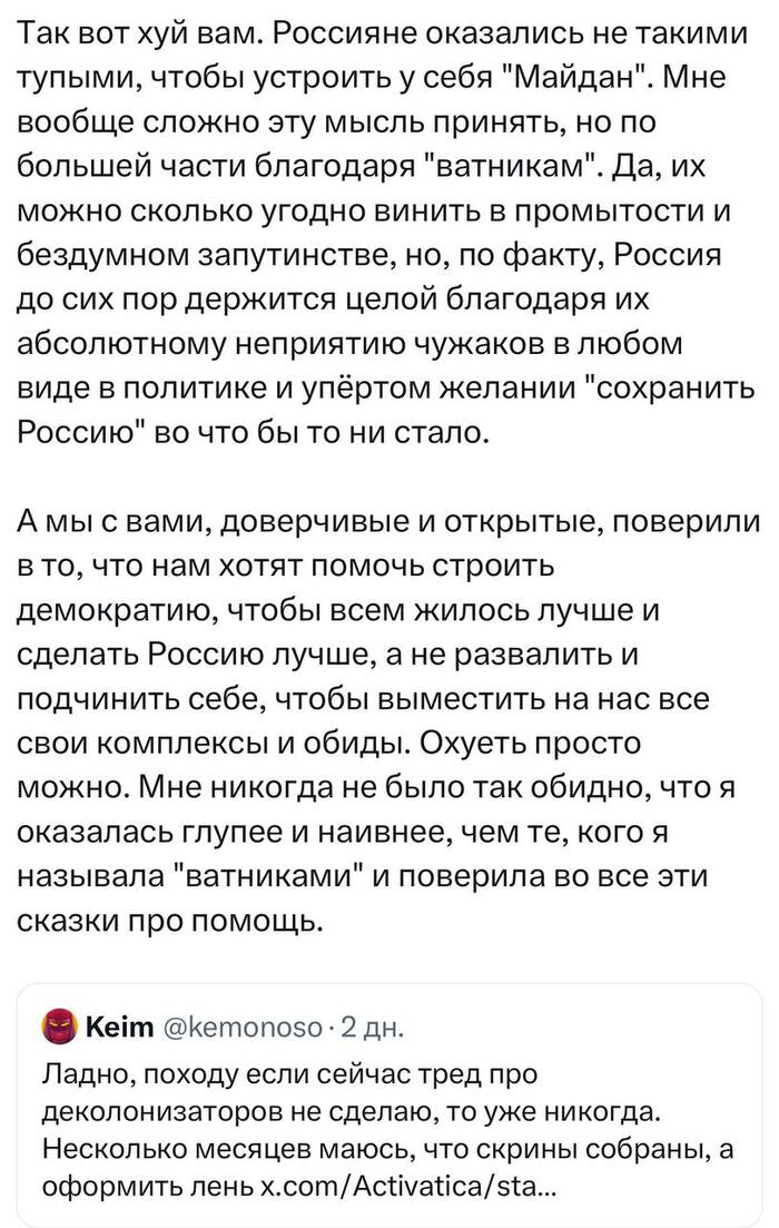 Как часто другой человек на улице желает обогатить тебя и сделать так чтобы ты жил лучше? Никогда. В основном все хотят с тебя что-то поиметь и тебя в придачу. Со странами так же. Одни страны хотят поиметь других во благо себя. Странно, что до сих пор есть люди, которые верят, что одни страны хотят добра другим. Мы живем в жестоком сука мире, где за убийство тебя закроют в тюрьме, но за убийство на фронте похвалят, заплатят и медаль дадут. Таковы правила игры этого мира, где жестокость это абсолютная норма человеческого существования. Поэтому ни одна страна не будет помогать другой просто так. Верить что Европа и США желают добра России так же глупо как считать , что Россия желает добра Турции или Болгарии. Все страны дружат пока выгодно дружить, но если выгоднее забрать развалив страну - ну что же, делают так. Розовые очки либерастов хороши только на видео в ютубе. В реальности - все друг друга имеют при первой возможности. Даже либерасты либерастов.