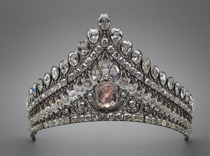 Вот уж где русский стиль проявился во всем великолепии. Всегда выигрышное сочетание бриллиантов и жемчуга, элементы популярного в 19 веке стиля lover’s knot и, конечно же, традиционная форма кокошника, — все это объединилось в роскошной Большой бриллиантовой диадеме. Она была изготовлена в начале 1830-х годов, предположительно, придворным ювелиром Яном Готтлибом-Эрнстом для императрицы Александры Федоровны, жены Николая I, — возможно, из старых украшений Марии Федоровны, завещавшей всю свою богатую коллекцию драгоценностей потомкам.