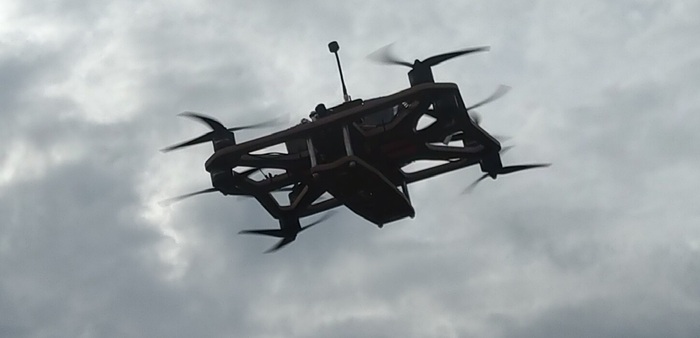 Поэтому основная часть дрона представляет собой просто одну деталь, что упрощает и значительно ускоряет процесс сборки квадрокоптера». Конструкция рамы представляла собой цельную фанерную пластину с вырезами для установки компонентов. Дополнительная верхняя фанерная пластина служила площадкой для аккумуляторной батареи и для установки курсовой камеры с помощью выламываемых из неё же вертикальных стоек.