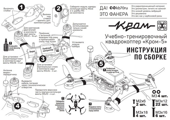 В итоге для производства рамы дрона требовались только фанера двух видов, пластиковые стойки и метрический крепёж формата М3 и М2, доступный в специализированных магазинах.