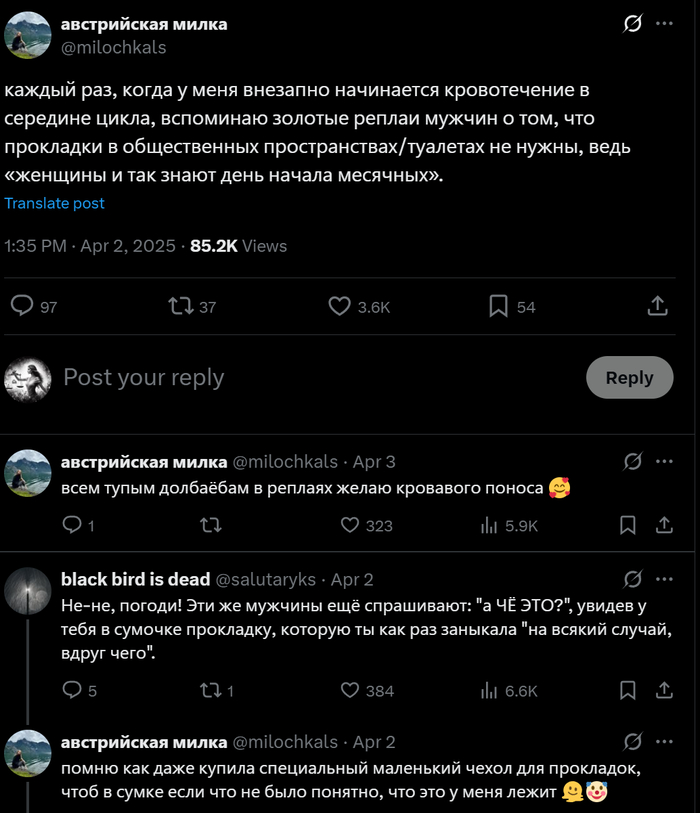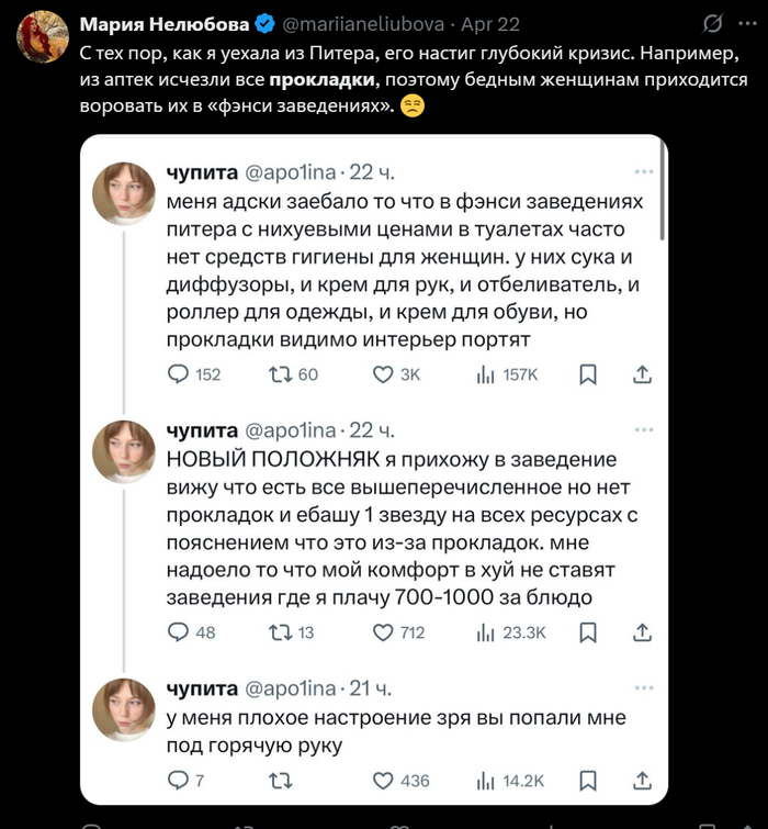 Прокладки в общественных заведениях-удобно, НО: в персональных упаковках, что сразу же удорожает такой "добровольный жест" для заведения, плюсом-в туалетах с "большой проходимостью" придется что-то думать с мусорками, иначе запах будет ойой. В большинстве контор, уж простите, их просто уведут, никаких запасов не хватит. Одну используют, парочку в сумочку-на всякий случай, раз уж бесплатно. И да, обычно женщина знает, когда у нее цикл, и кладет "запаску" в сумку своевременно. Осечки бывают, но нечасто, если только это не проблемы со здоровьем, а с ними лучше ко врачу. И к сожалению (я сама женщина), люди правы- то, что женщины творят в туалетах- никакая бесплатная прокладка не спасет, воспитания не хватит