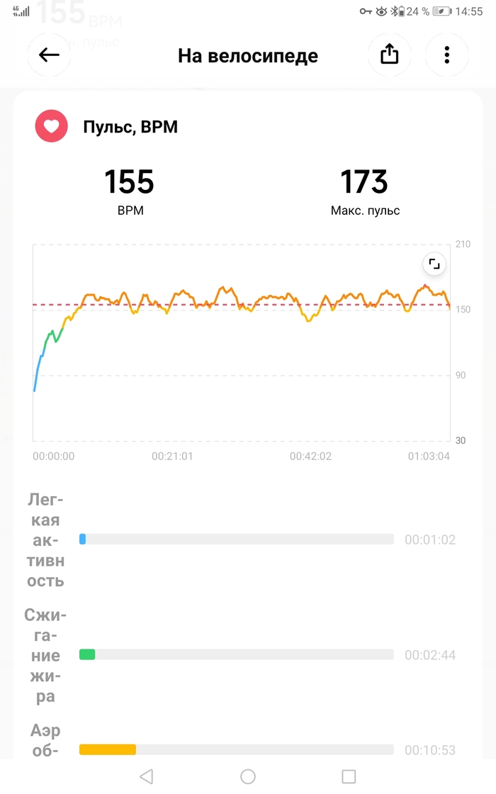27 км ехал, прямо себя заставлял напрягаться, не изо всех сил но процентов на 85. Вот такой график пульса получился. Может есть кто в теме, правильно такую пульс держать или прибавить или наоборот ослабить натиск?