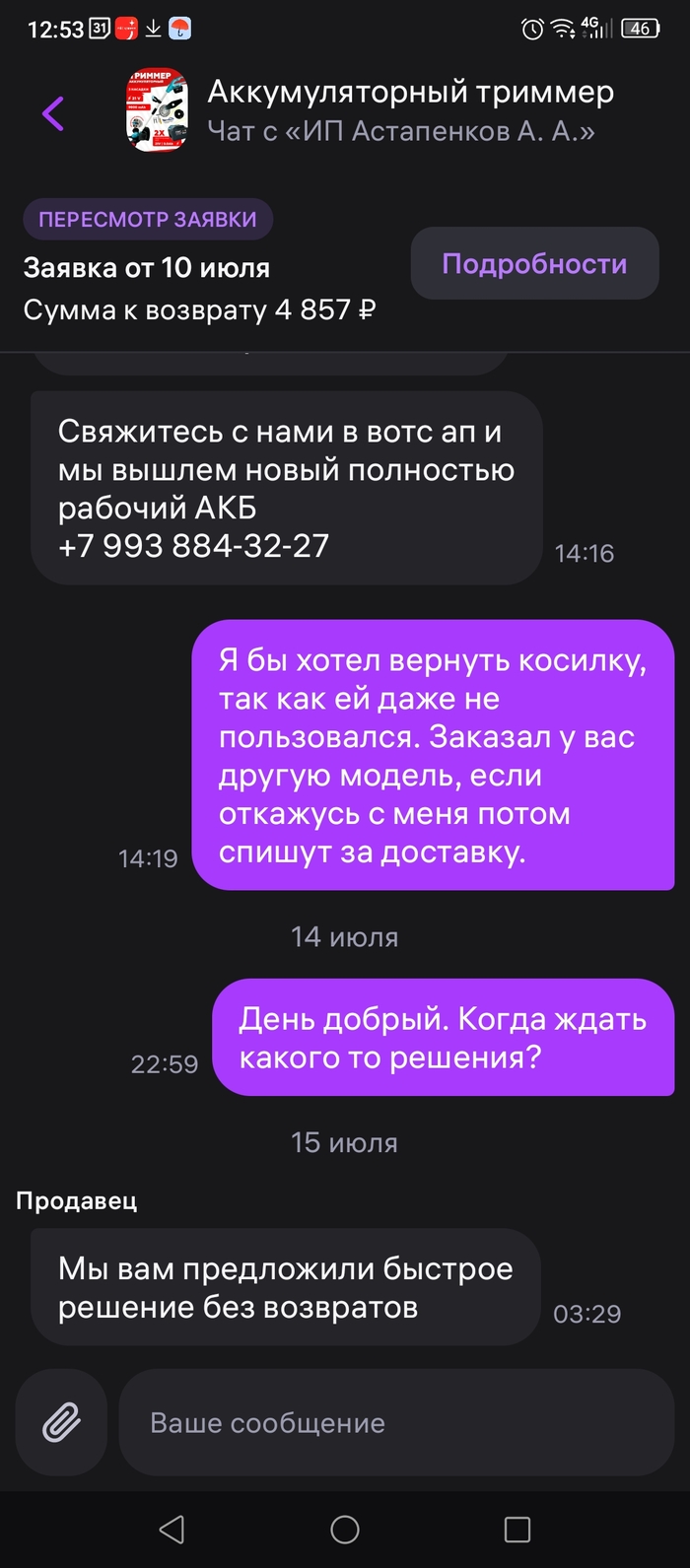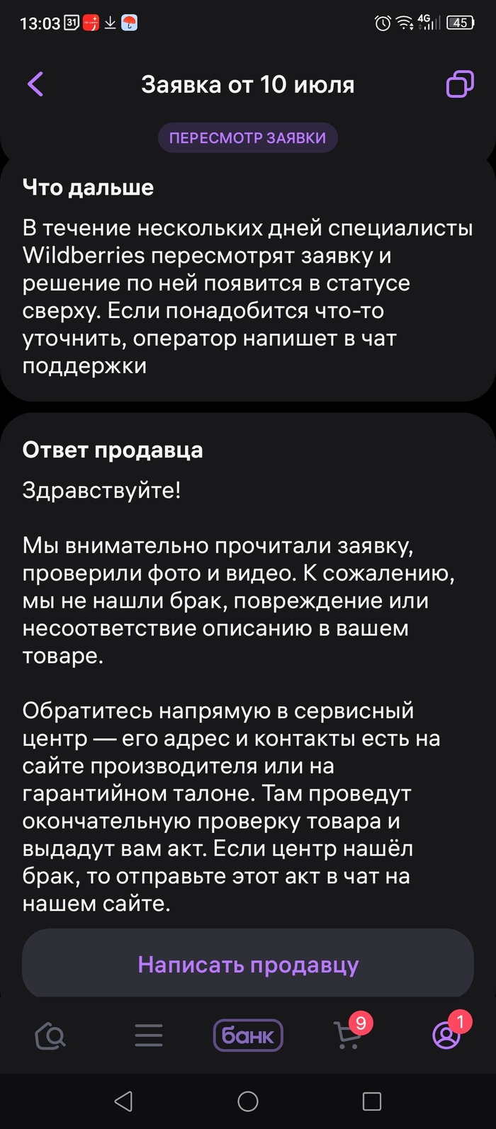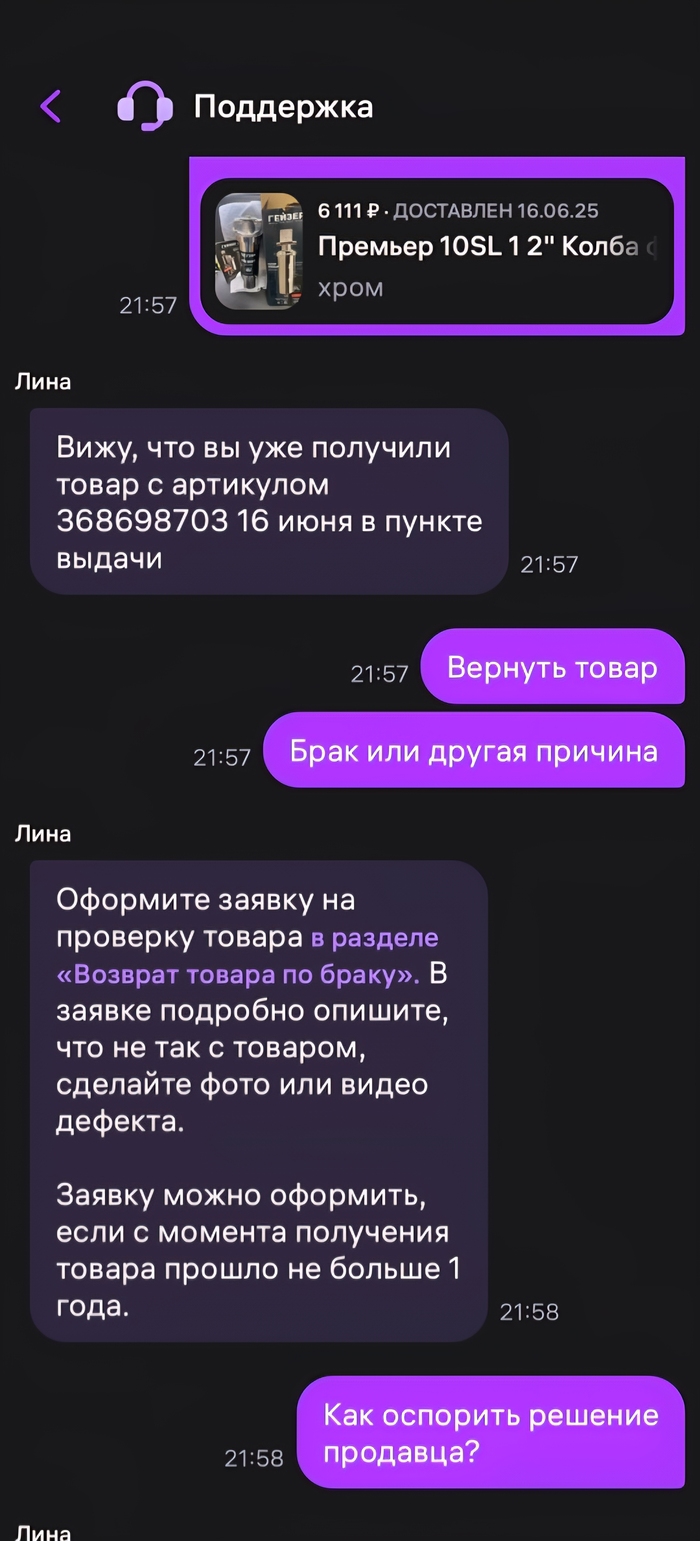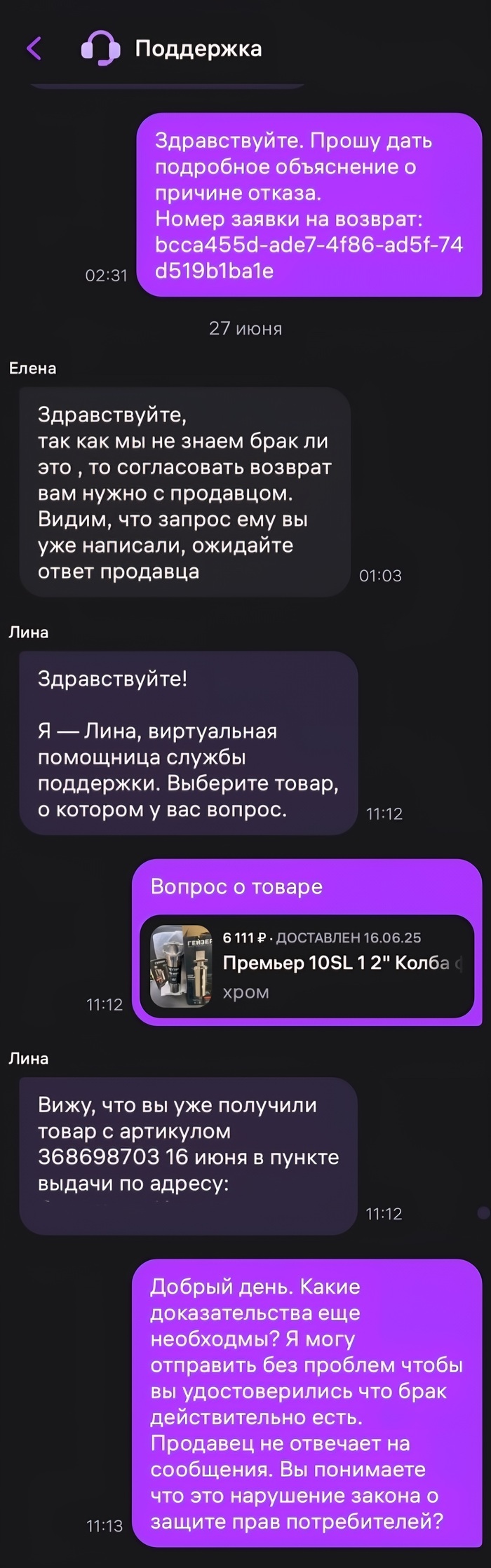 Ок. Оформляем возврат по браку. Прикладываю фото в поддержку, дополнительно снимаем видео.