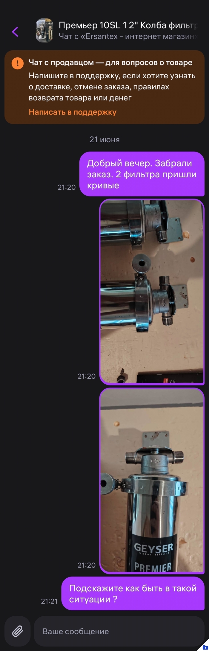 Заказал четыре колбы Geyser Premier на Wildberries для коллектора через аккаунт жены, потому что у неё кошелёк подключен и цены были выгоднее. Пришли две нормальные, а у двух крышки кривые — металл повело, шайба перекошена, нормально не закрутить.