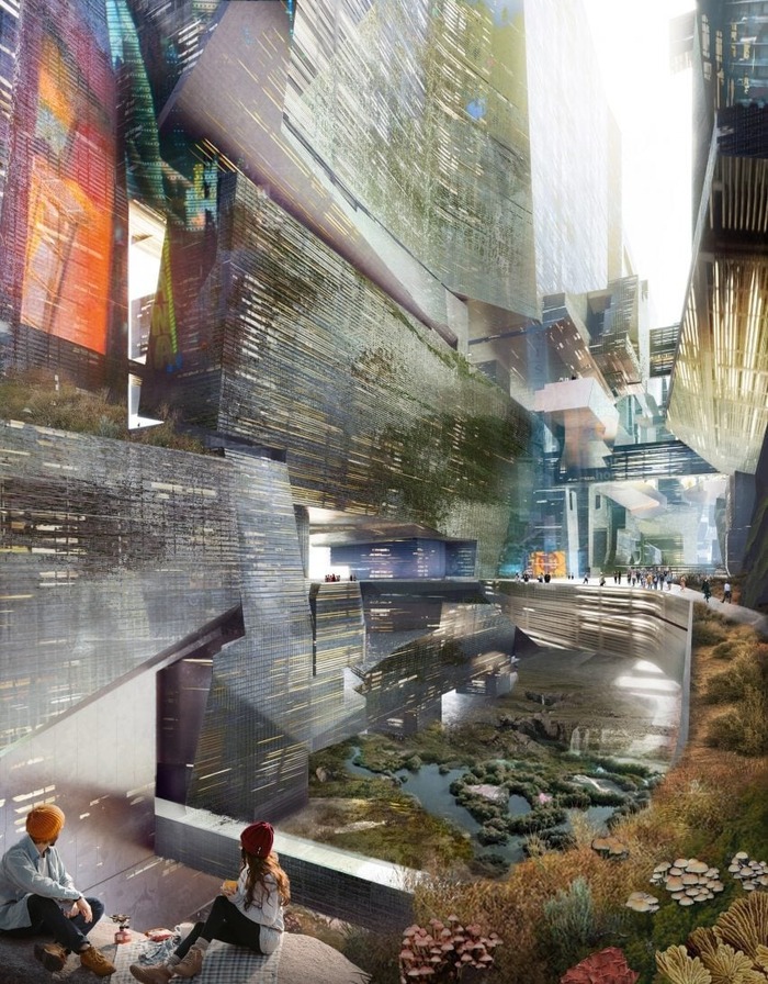 Пространство между домами предполагается заполнить плотной городской застройкой с садами и парками, а под землей проложить высокоскоростную железнодорожную линию.