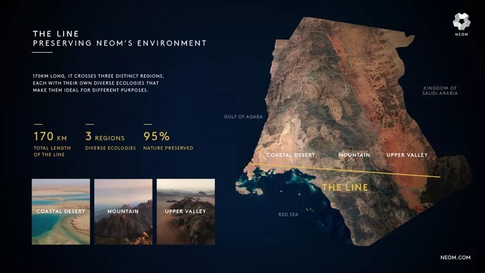 The Line заявлен как абсолютно экологичный город с нулевым углеродным следом, использующий исключительно возобновляемые источники энергии и технологии искусственного интеллекта для управления городской жизнью (хотя некоторые эксперты считают, что даже на этапе строительства "углеродный след" этого проекта превысит все разумные пределы).