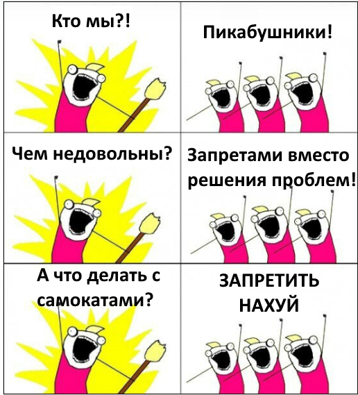 Ведь люди не выступают массово против мотороллеров, электроскутеров и пр. ТС. Просто потому, что они ездят по дорогам общего пользования. А самокаты ездят, сука, по тротуарам. Управление самокатами никак не регулируется. Давайте, блядь, разрешим машинам объезжать пробки по тротуарам, а потом будем пиздеть, что люди против машин. Не, ну а хуле...