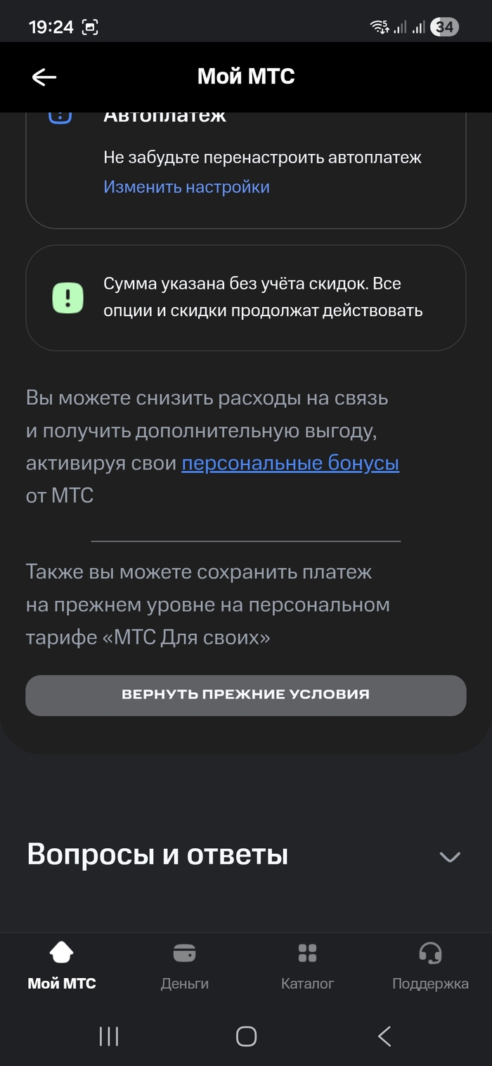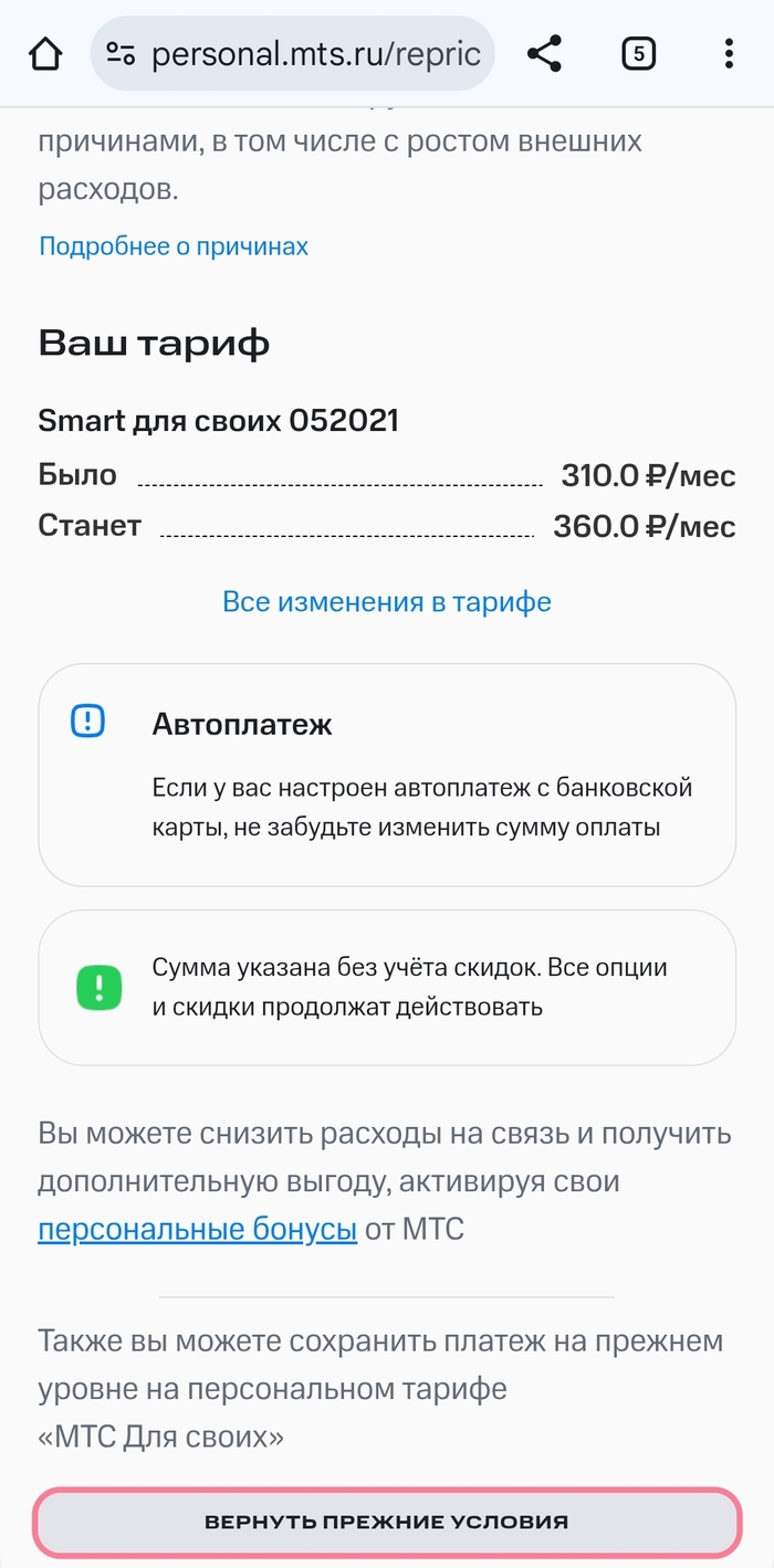 Получил сейчас замечательное сообщение от мтс, о повышении платы за тариф. С 310 до 360р за весьма куцый пакет "интернета" и минут. И заманчивая кнопочка "Вернуть прежние условия". Нажимаем и ....