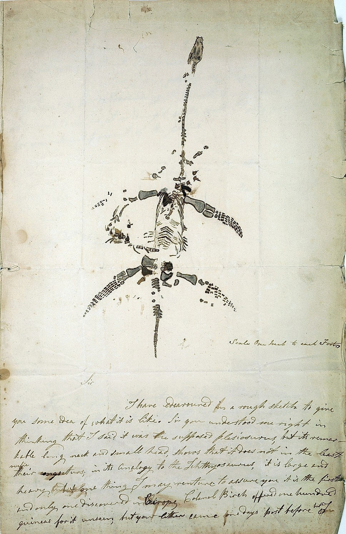 В ноябре 1810 года от туберкулёза и травм от падений со скалы умирает отец семейства – Ричард, что был главным в семейном промысле, и теперь его роль перенимает одиннадцатилетняя Мэри. Перенимает и уже на следующий год находит между скал зубастый череп с крупными глазницами, а спустя несколько месяцев и остальной скелет длиной в пять метров – ихтиозавра. Окаменелость была продана за 23 фунта стерлингов и отправлена в Лондон, где вызвала ажиотаж – научное сообщество искренне пыталось классифицировать этого “ископаемого крокодила”, но в существующей систематике животного царства тому просто не было места. Постепенно за ним закрепилось название “рыбо-ящер”, что по латыни звучит как Ichthyosaurus, а он сам был выкуплен Британским музеем.