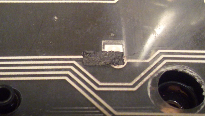 Вскрытие показало, что перегорела дорожка, которая идет к пробелу от шины (к сожалению фотографий "до" не сделал :(.