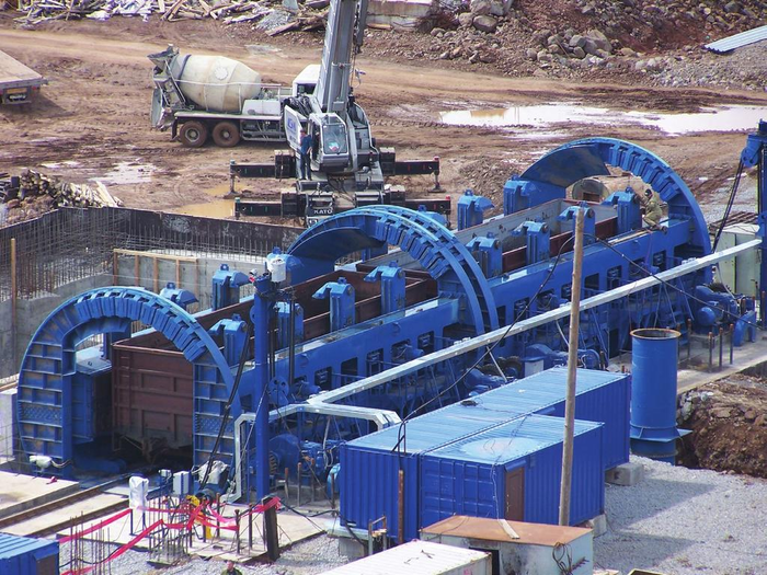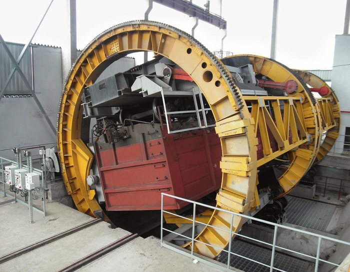 Вагоноопрокидывателем тут является неподвижная спиралевидная конструкция, а вагоны-самосвалы собственной конструкции.