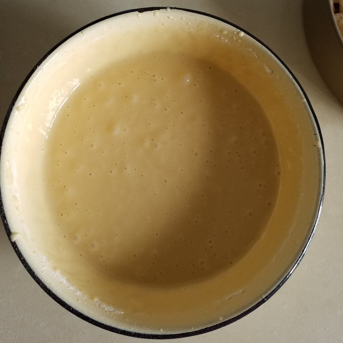 Первый же найденный в интернете рецепт я забраковала. Крем выглядел слишком густым, взяли сомнения, что он пропитает коржи. Зато второй выглядел бодрячком. На него я и закупила продукты, радостно сфотографировала начало и принялась за работу.