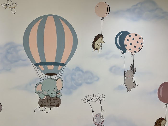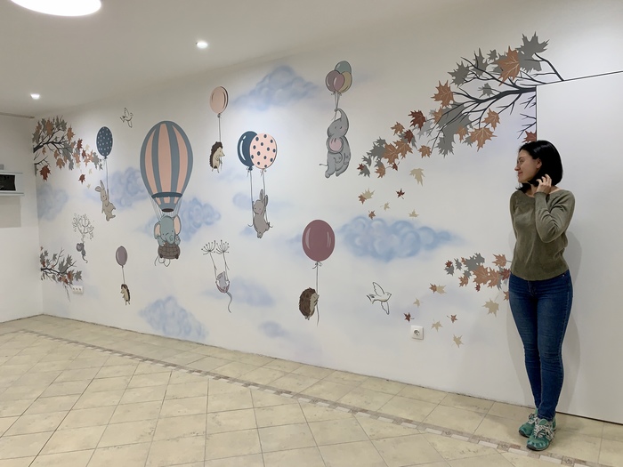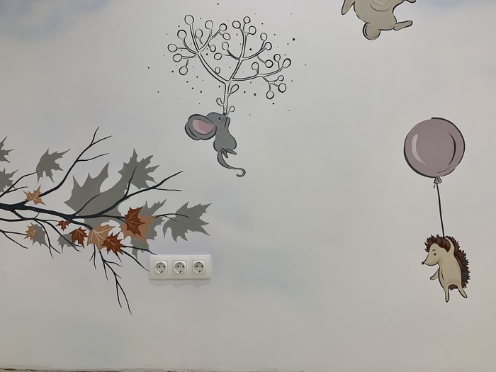 Оставались цвета, не знали что нарисовать. Решили что тут будет шкаф, нарисуем что захочется и как получится, один фиг закроем. Получилась так хорошо, что шкафа там не стояло.