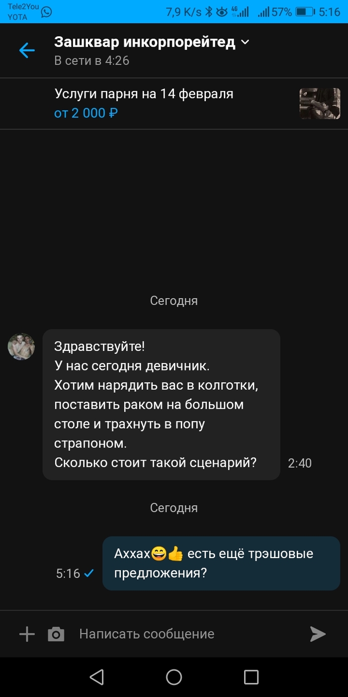 Пока написал только какой-то 🏳️🌈 СерГей, осуждающее сообщение. Искать мужчин в разделе услуг на 14 февраля... Сразу спалился)