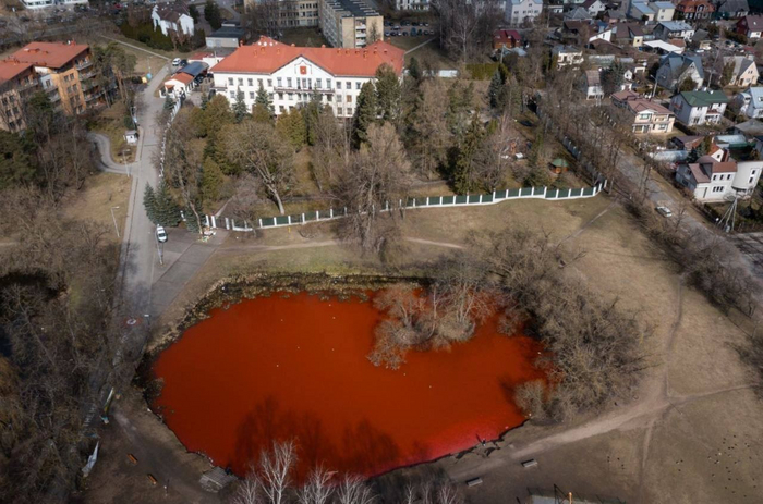 Воду в пруду напротив российского посольства в Вильнюсе окрасили в красный цвет