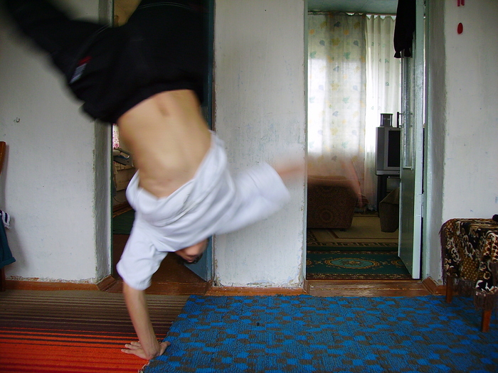 Стали мы его выслеживать, выяснили где живет, караулили недалеко от дома, потом ездили следом. Наверное мы стали очень приметны, он познакомился и с нами. Много говорил о спорте, показывал как правильно делать упражнения, отжиматься, подтягиваться. Но мы все ждали, когда кто-нибудь из нас пропадет. В наших рюкзаках лежали пугачи, рогатки и носки набитые подшипниками. Ждали когда прижмем его. Но он все тянул и никто не пропадал. А я потихоньку научился подтягиваться на турнике, если раньше я умел дерганные три раза, то дошел до смелых 10. Научился ходить на руках. Стал выносливее на велосипеде. Фото спустя, 2003-2004, не пинайте штативов тогда не было, задержку ставишь и начинаешь позировать: