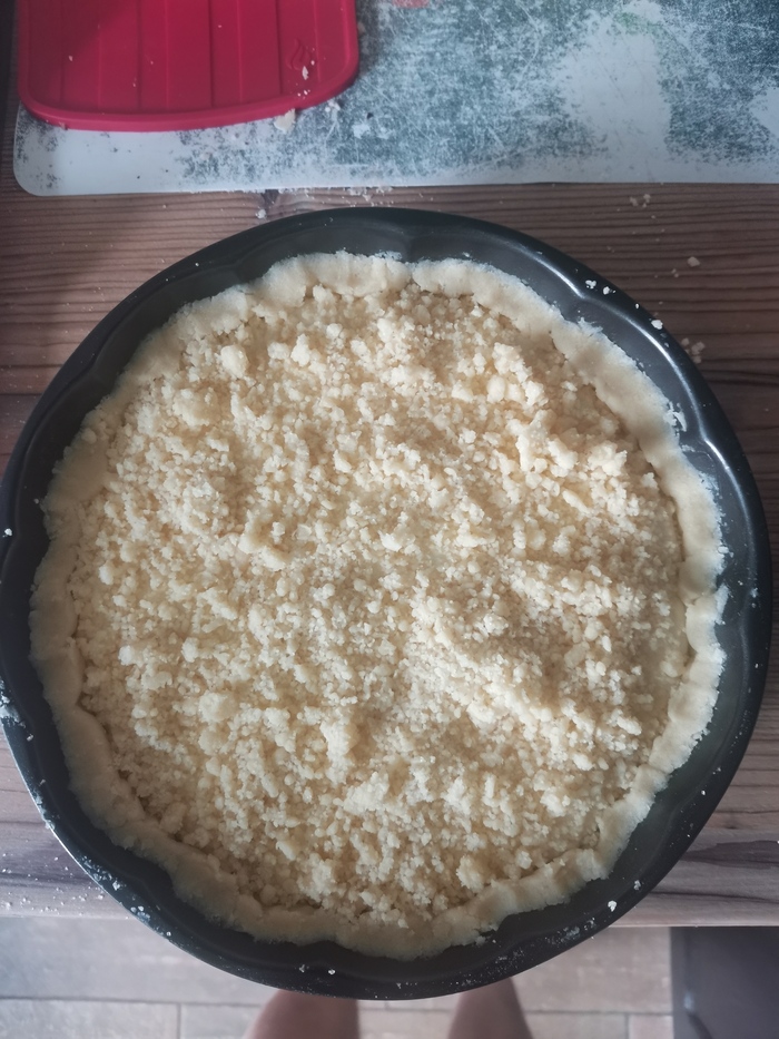 5) Берем форму, смазываем ее. Посыпаем дно ровным слоем и еще приминаем к бортикам пальцами нашу посыпку.