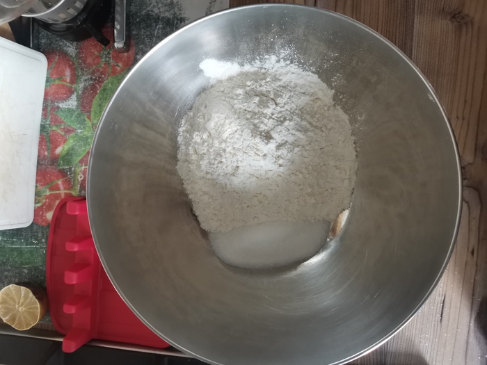 2) Берем глубокую ёмкость, высыпаем остатки сахара и муку и вручную перемешиваем венчиком, чтоб все перемешалось. Добавляем щепотку соли.