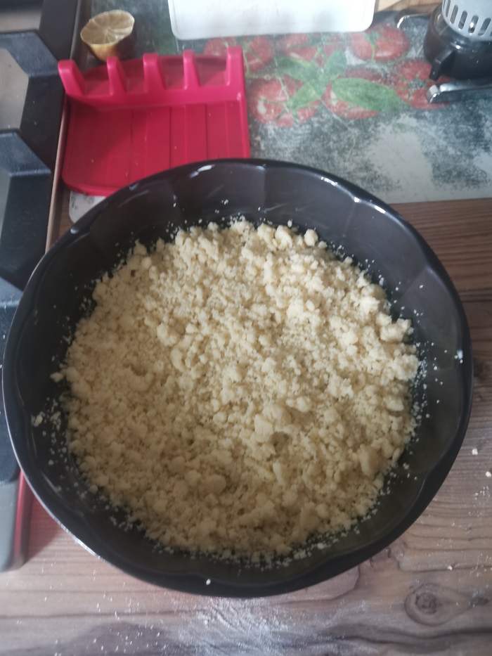 4) теперь пальцами посыпаем масло и перетираем. Как по мне, так чем меньше фракция, тем интереснее. Постигаем дзэн, работая руками долго и упорно)