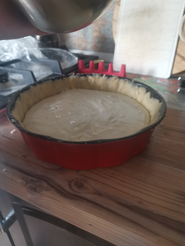 6) Выливаем в нашу заготовку творожную массу, утрясаем чтобы все растеклось внутри. Посыпаем сверху остатками посыпки и ставим в духовку на 180-200 градусов на 30-40 минут.