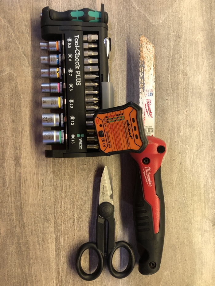 Складная ножовка по металлу иногда очень выручает. Ножницы в основном использую для нарезания термотрубок. Тестер подключения розеток. Иногда используется и мелкий набор головок.