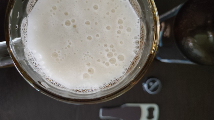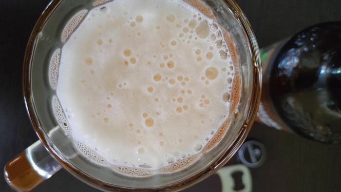 Берём открывалку, открываем. Пена белоснежная, её очень мало. Осела средне по времени. К бокалу липнет неплохо.