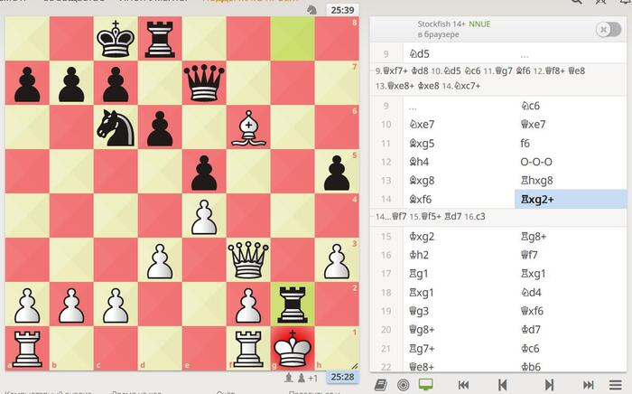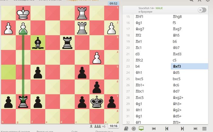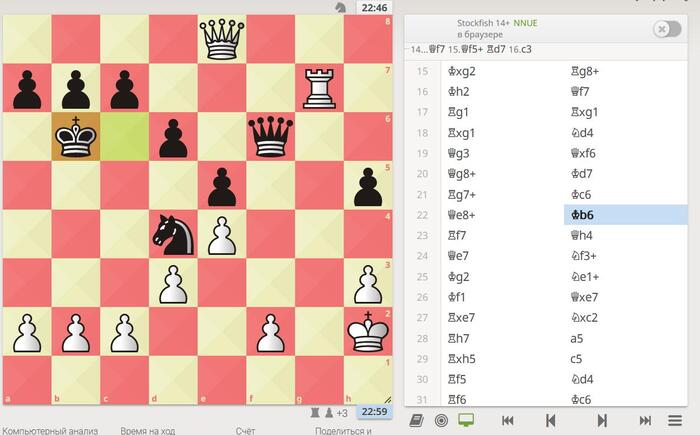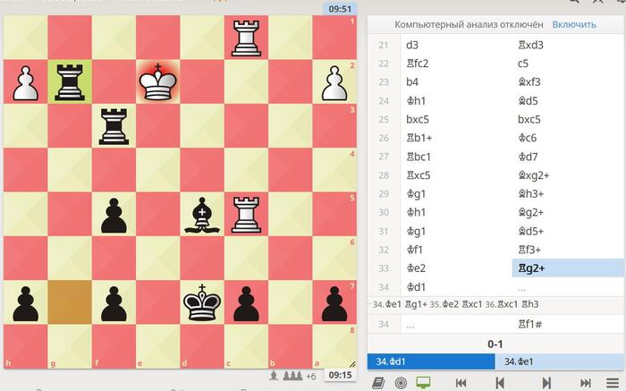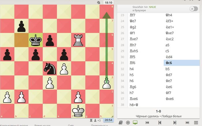 Но как видно по позиции ,все таки вариант с 16... Кf5 был лучше, т.к. 16...f5 - и после 16. схd4 - черные теряют фигуру и соперник сдался.